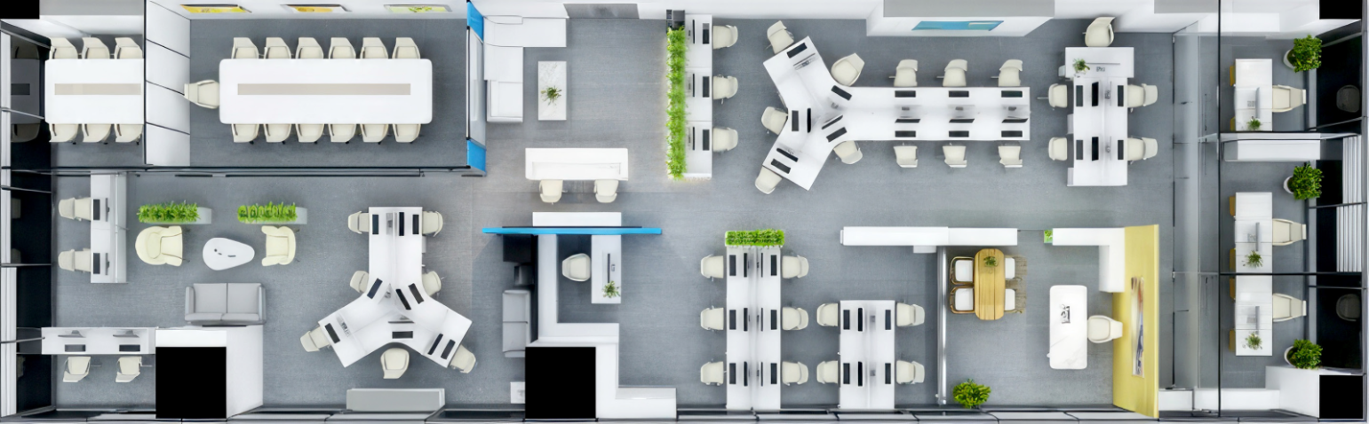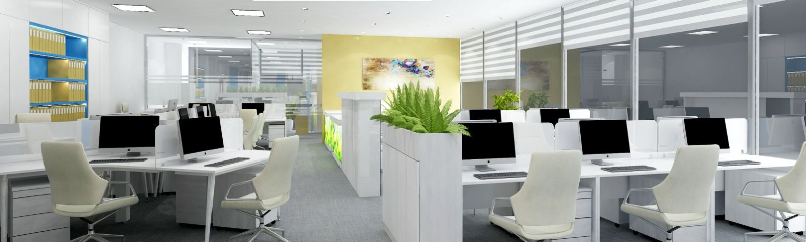 Modern boardroom is enclosed in glass to ensure transparency while maintaining acoustical privacy, with a clean white palette and vibrant brand visuals to impress visiting partners and clients.