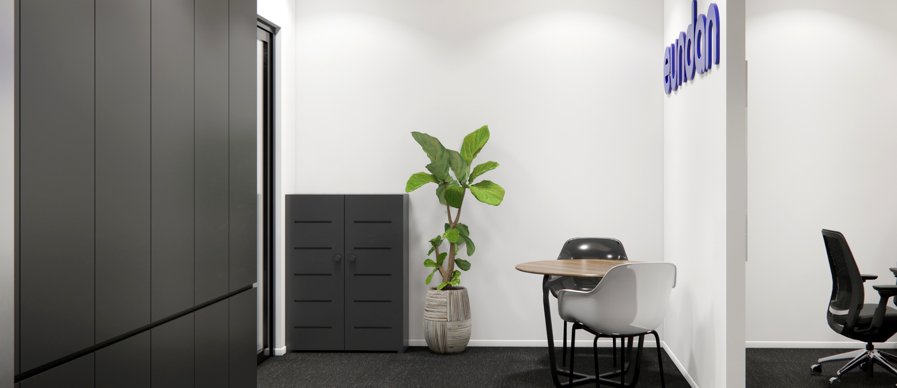 The central reception zone features a logo backdrop and casual meeting corner, creating a welcoming first impression, while the open-plan workstation area maximizes daylight and promotes team visibility.