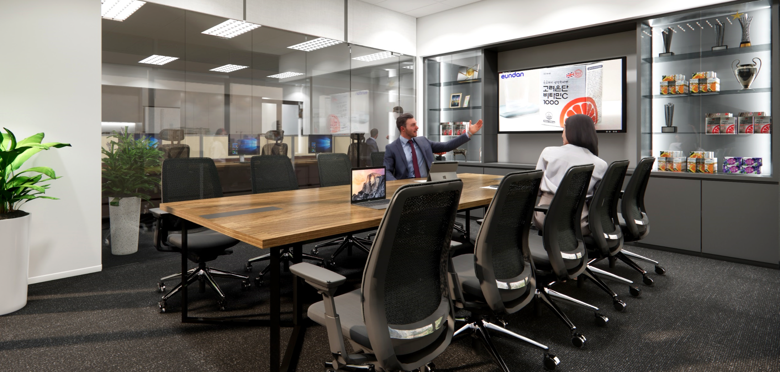Positioned by the glass facade, this minimalist director’s office maximizes natural light and privacy, with warm wood finishes and built-in storage fostering both focus and functionality.