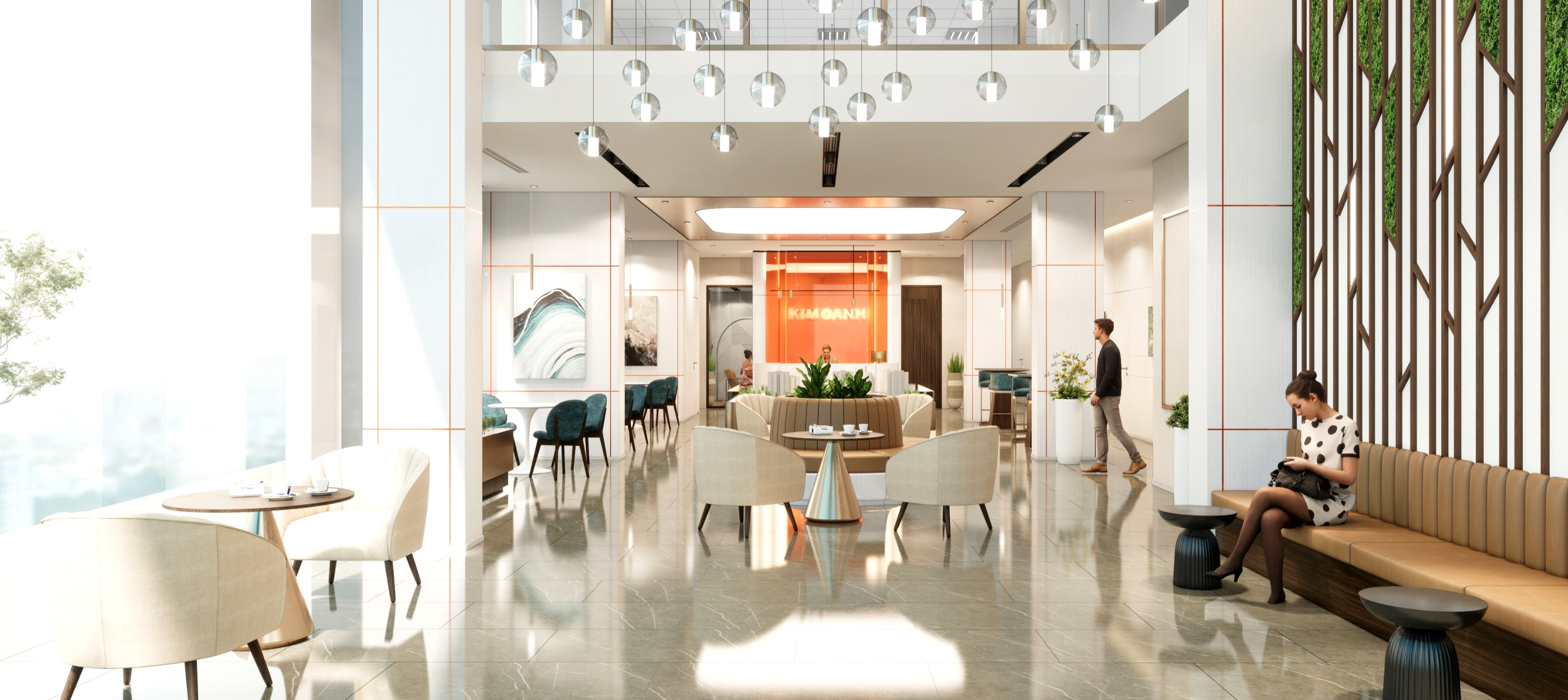Kim Oanh’s grand double-height reception blends biophilic wall design, luxurious furnishings, and a central logo backdrop to deliver an impressive sense of scale and elegance for corporate guests.