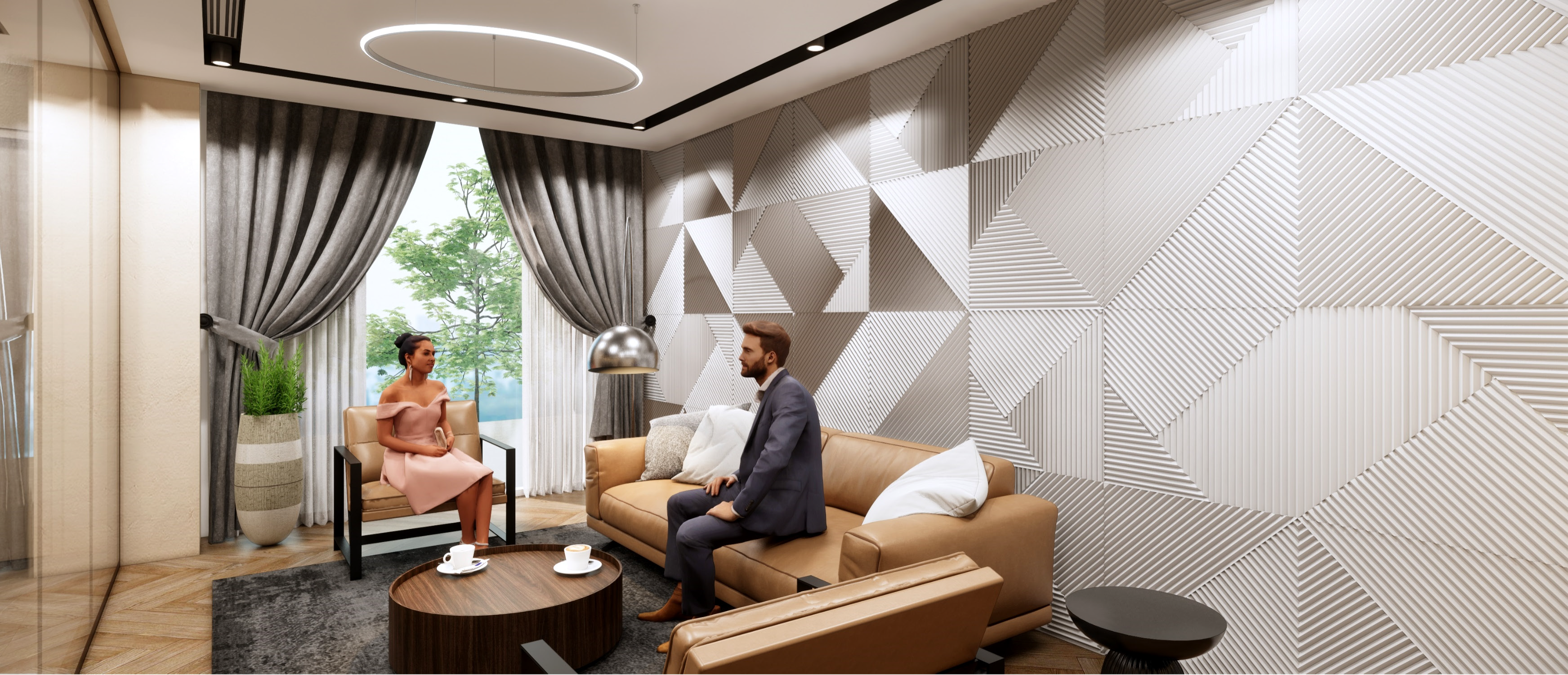 Private guest lounge combines premium finishes, soft lighting, and acoustic wall textures to create an exclusive and refined setting for high-level meetings and client receptions.