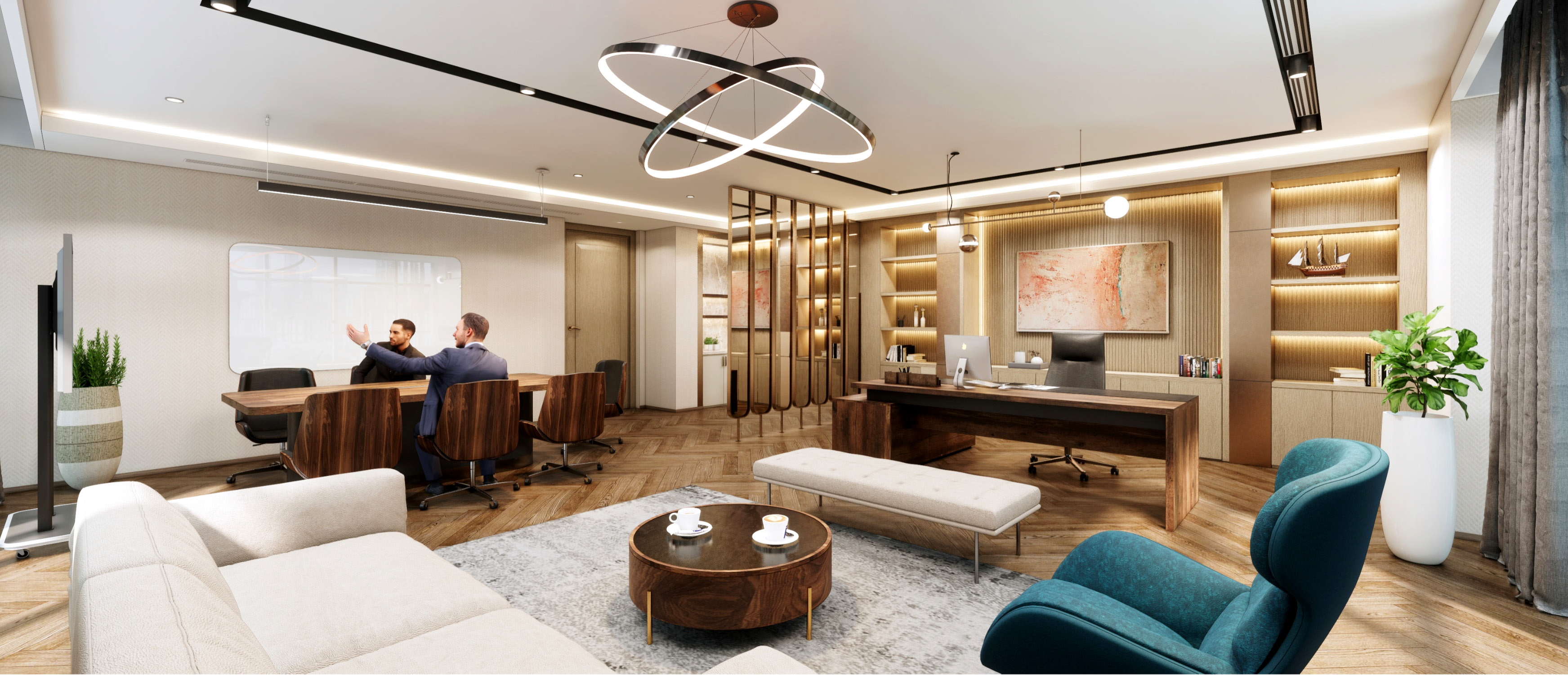 A luxurious CEO office exuding sophistication and modern elegance. The space is furnished with a large executive desk in dark wood, complemented by a plush seating area with a leather sofa, black lounge chair, and a round coffee table.