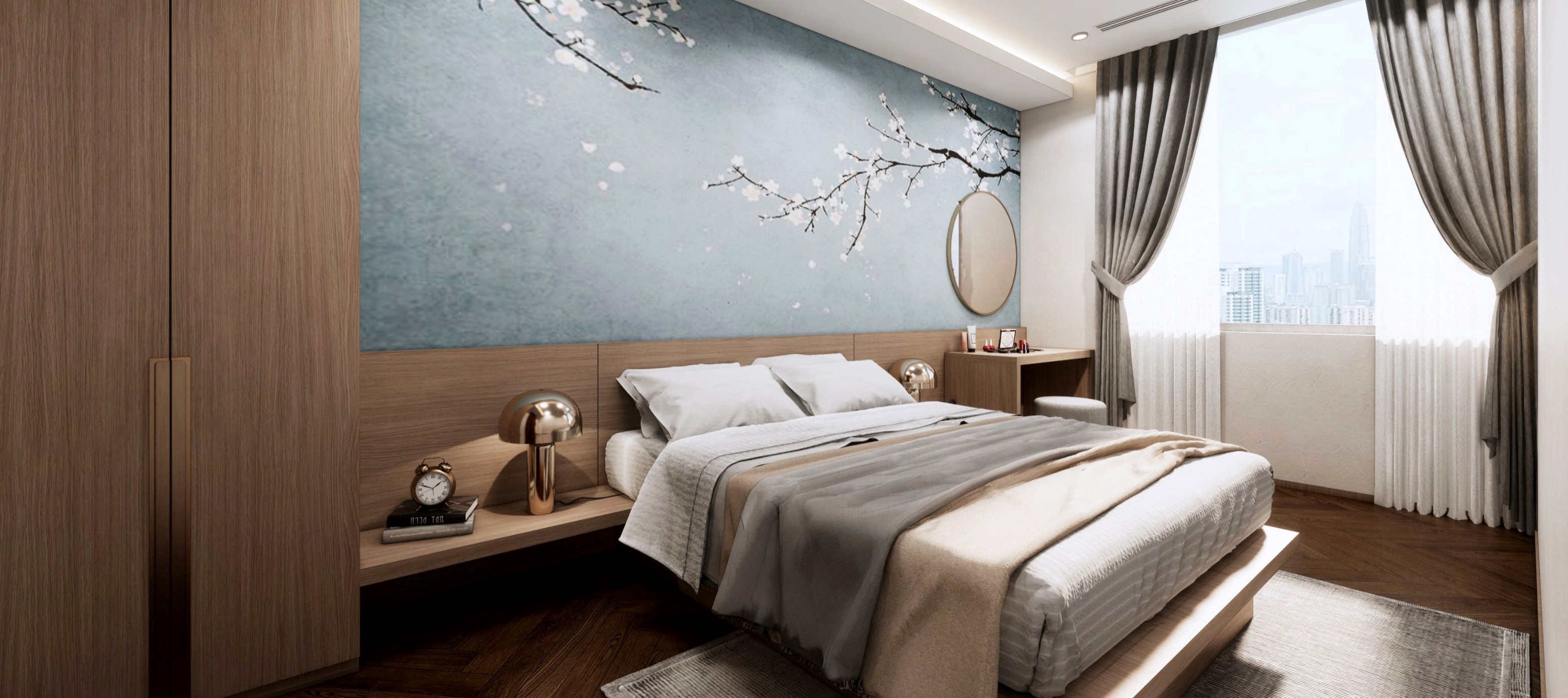 A cozy and elegant bedroom designed with a modern touch. The feature wall behind the bed showcases a large mural of blooming cherry blossoms against a soft blue background, creating a calming and serene atmosphere.