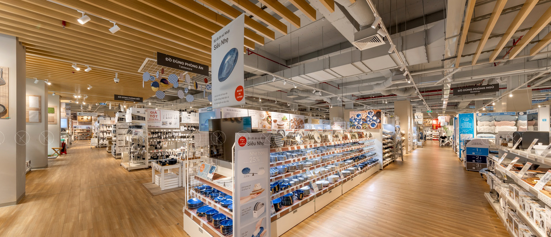 The wooden ceiling baffles, layered lighting, and thoughtful display design guide visitors through curated living spaces—immersing them in the essence of Japanese functionality and simplicity